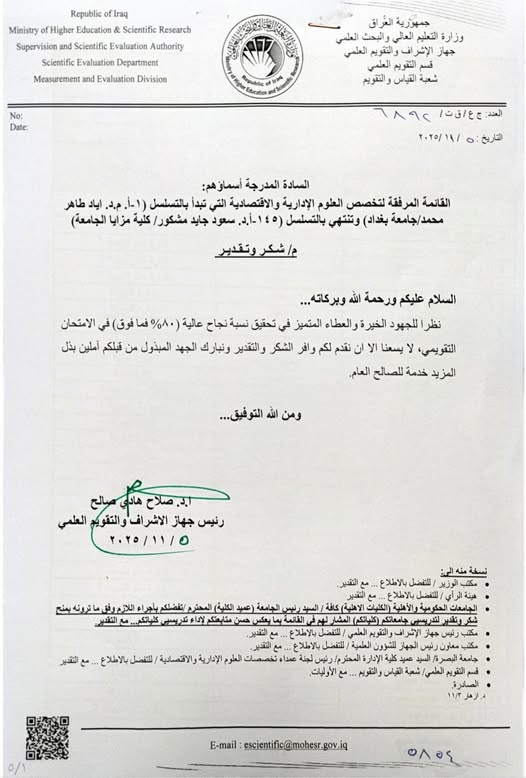 عميد كلية الإدارة والاقتصاد يحصل على كتاب شكر وتقدير من وزير التعليم العالي والبحث العلمي ...اقرأ المزيد
