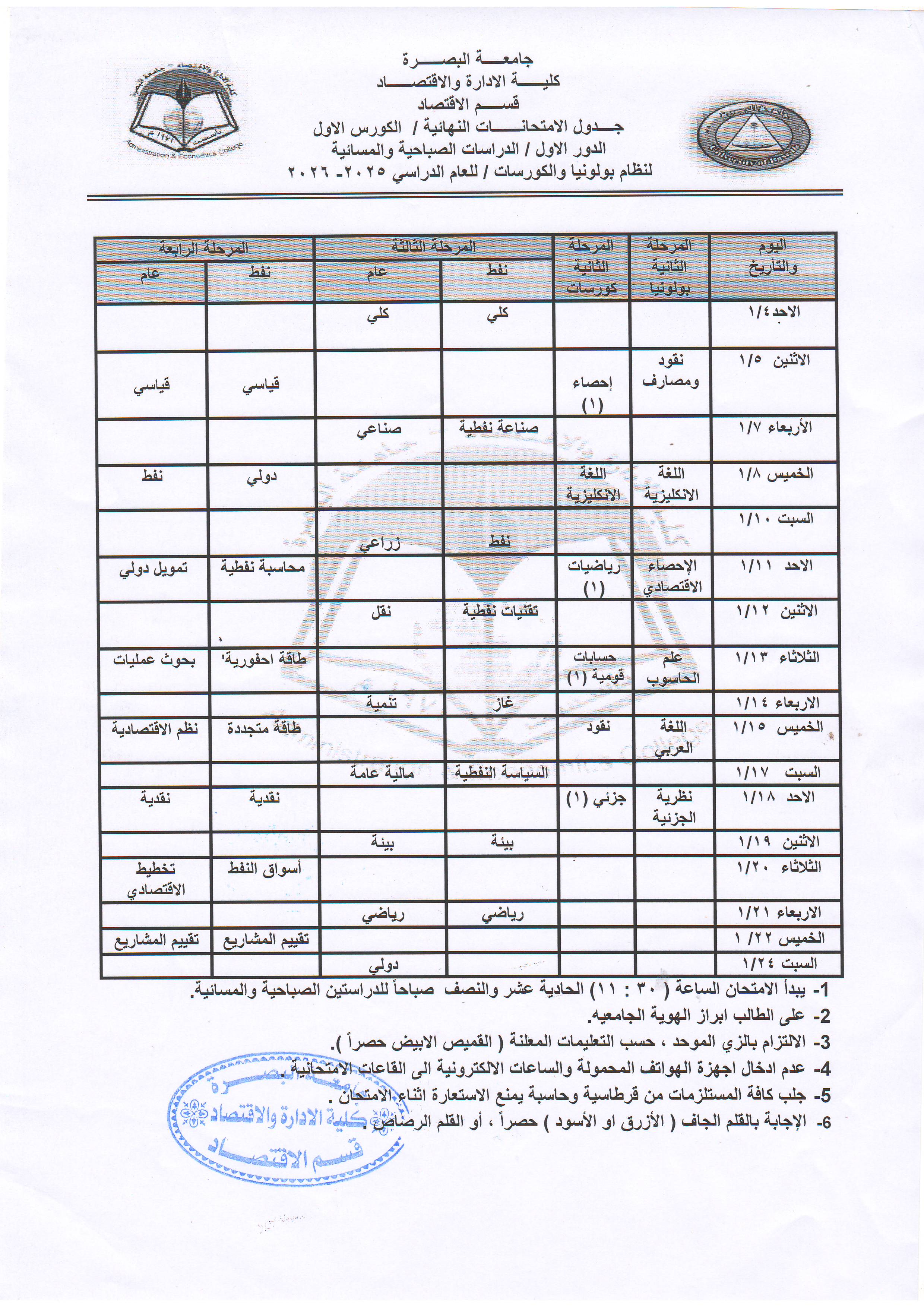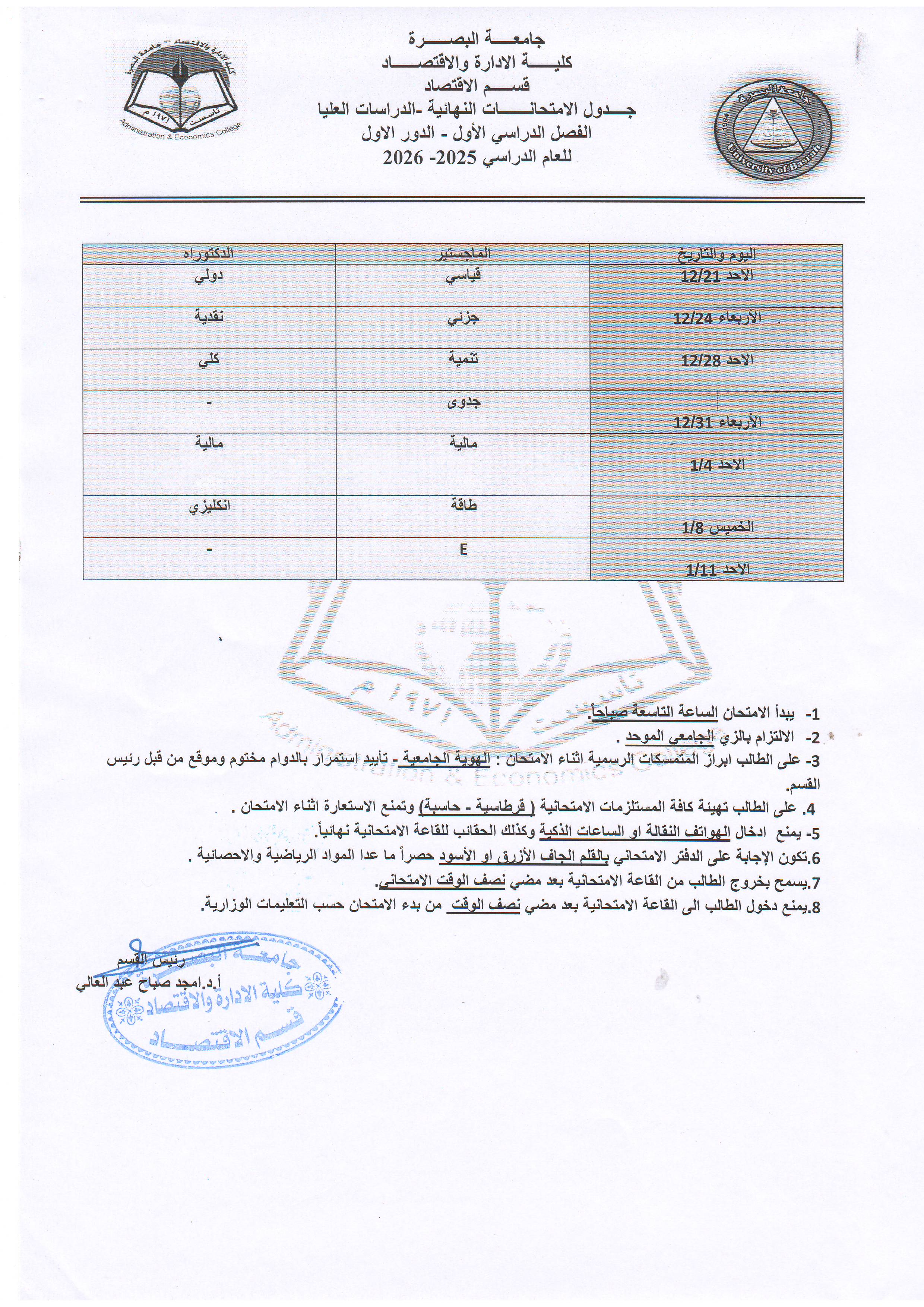 الامتحانات النهائية/الجداول الالكترونية/قسم الاقتصاد