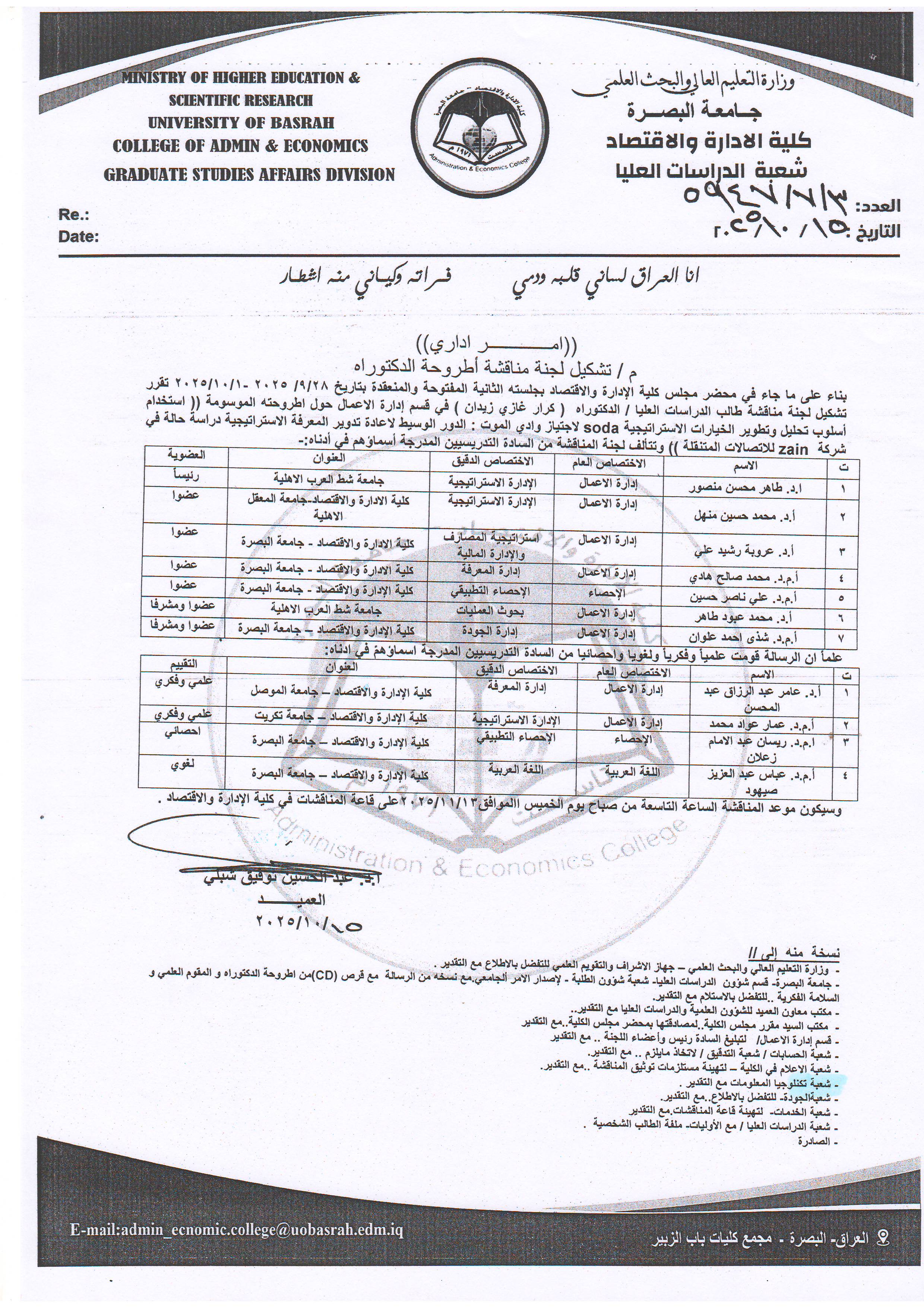 تقرر تشكيل لجنة مناقشة طالب الدراسات العليا / الدكتوراه (كرار غازي زيدان) في قسم ادارة الاعمال حول اطروحته الموسومة (استخدام أسلوب تحليل وتطوير الخيارات الاستراتراتيجية soda لاجتياز وادي الموت: الدور الوسيط لاعادة تدوير المعرفة الاستراتيجية دراسة حالة في شركة zain للاتصالات المتنقلة).