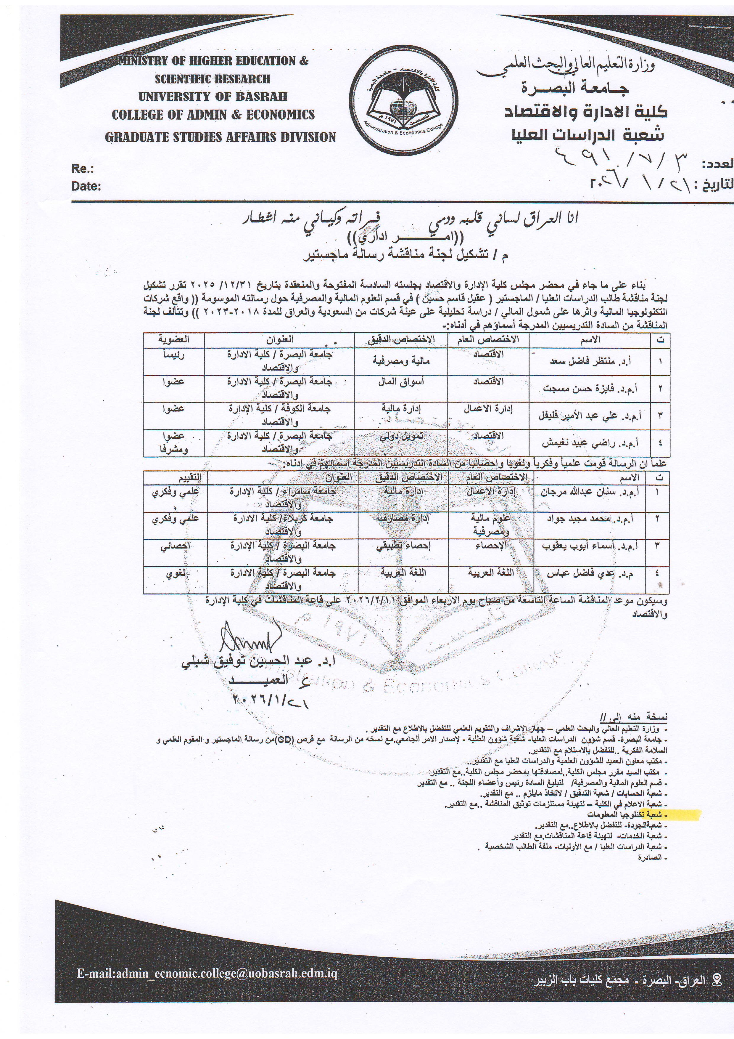 وسيكون موعد المناقشة في الساعة التاسعة من صباح يوم الاربعاء الموافق 11/ 2/ 2026 على قاعة المناقشات في كلية الادارة والاقتصاد.
