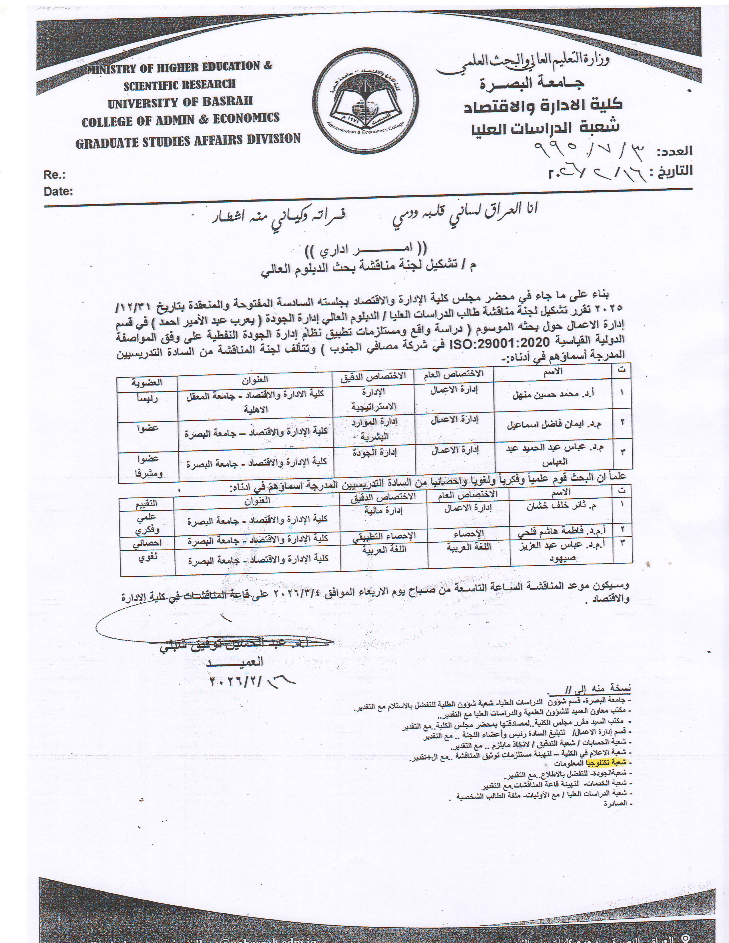 وسيكون موعد المناقشة في الساعة التاسعة من صباح يوم الاربعاء الموافق 4/ 3/ 2026 على قاعة المناقشات في كلية الادارة والاقتصاد.