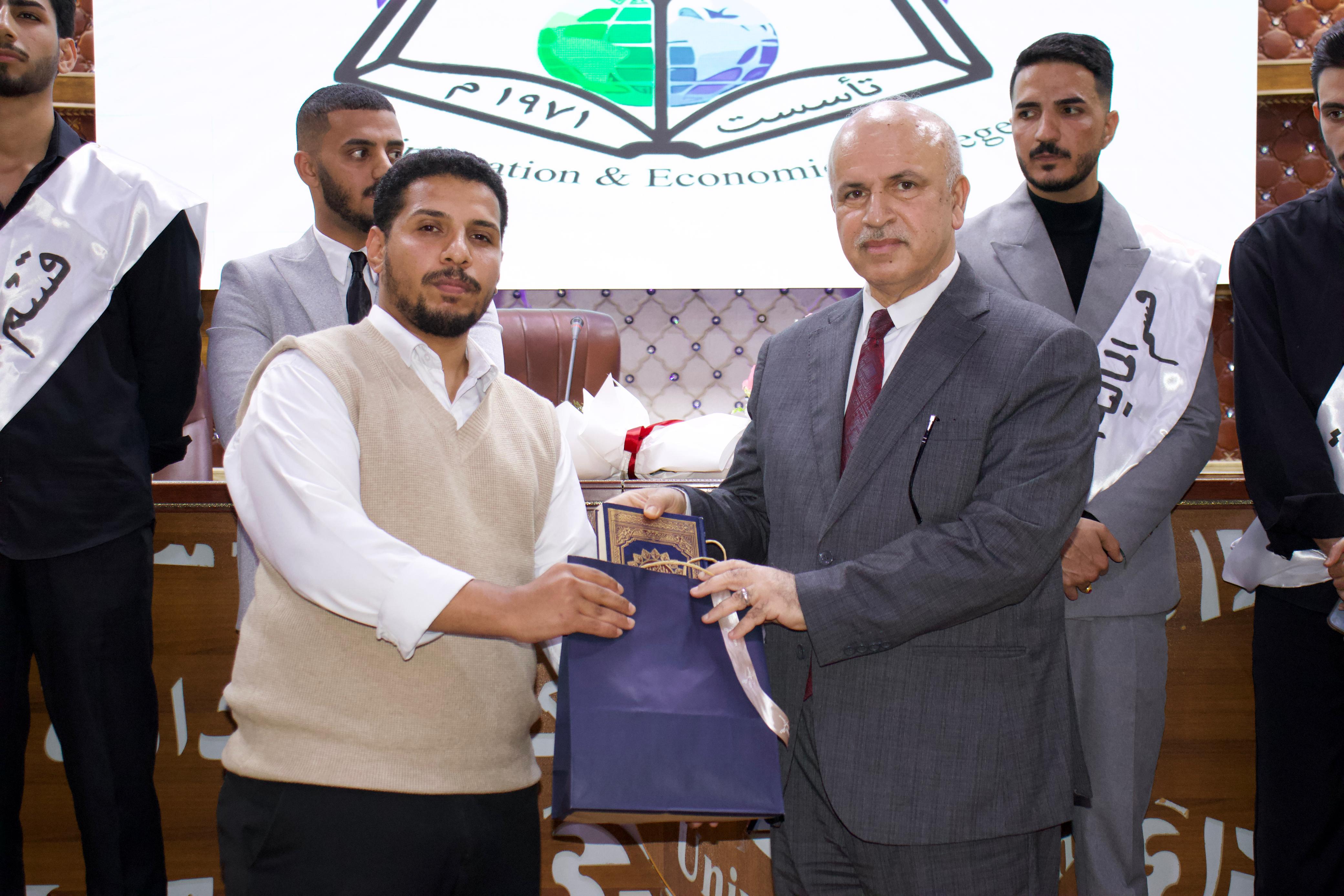 وشهد الحفل تقديم كلمة لأحد الطلبة نيابةً عن زملائه، عبّر فيها عن بالغ شكره وتقديره للسيد عميد الكلية وأعضاء الهيئة التدريسية، مثمّناً دورهم التربوي والعلمي في بناء شخصية الطلبة وتوجيههم نحو مستقبل أكاديمي واعد. كما تضمن الحفل إلقاء قصيدة شعرية جسّدت مكانة المعلّم السامية، حظيت بتفاعل كبير من الحضور، إلى جانب مبادرة فنية لطالبة من قسم الإحصاء تمثلت برسم صورة فوتوغرافية للسيد العميد نالت إعجاب الحاضرين.