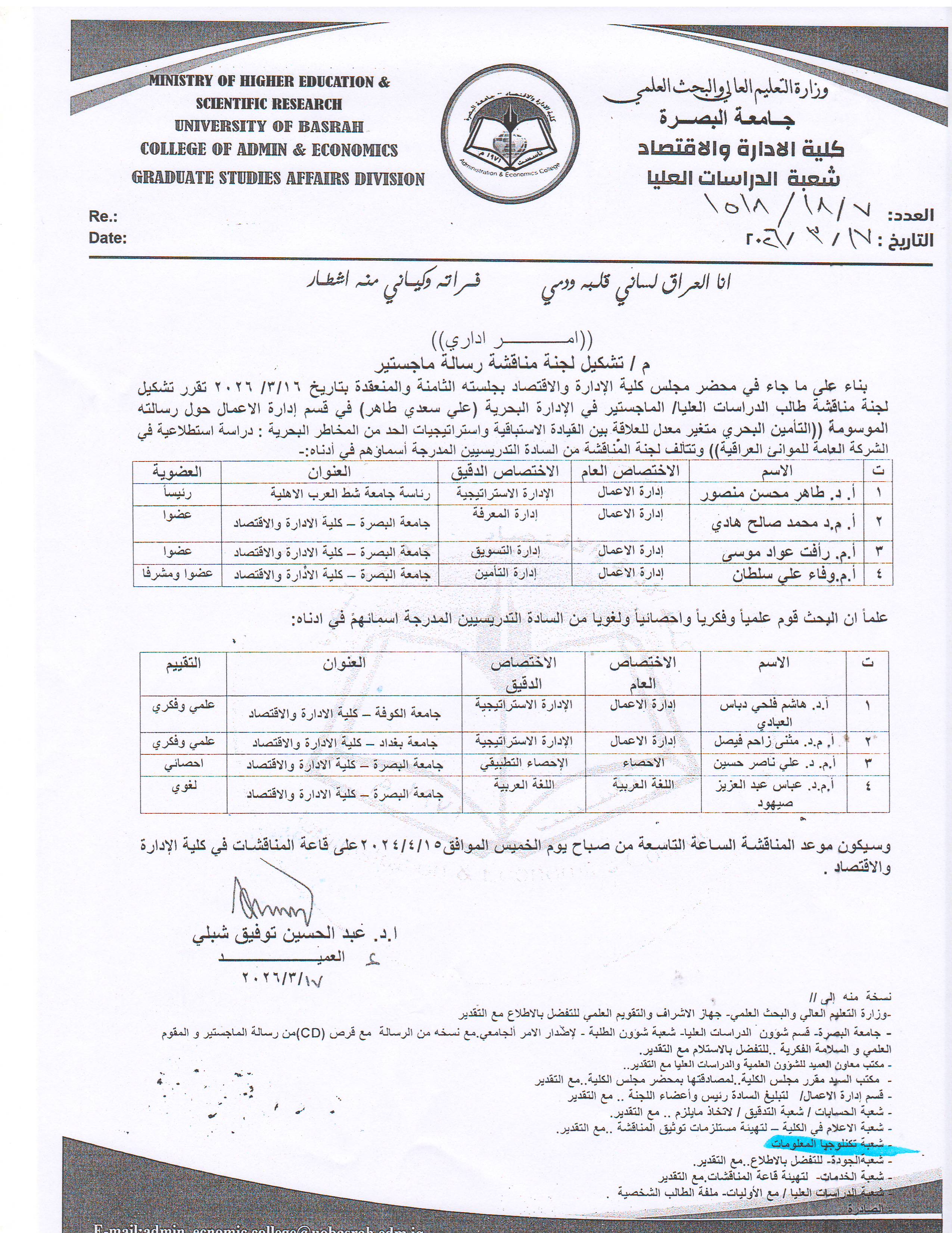 وسيكون موعد المناقشة في الساعة التاسعة من صباح يوم الخميس الموافق 15/ 4/ 2026 على قاعة المناقشات في كلية الادارة والاقتصاد.
