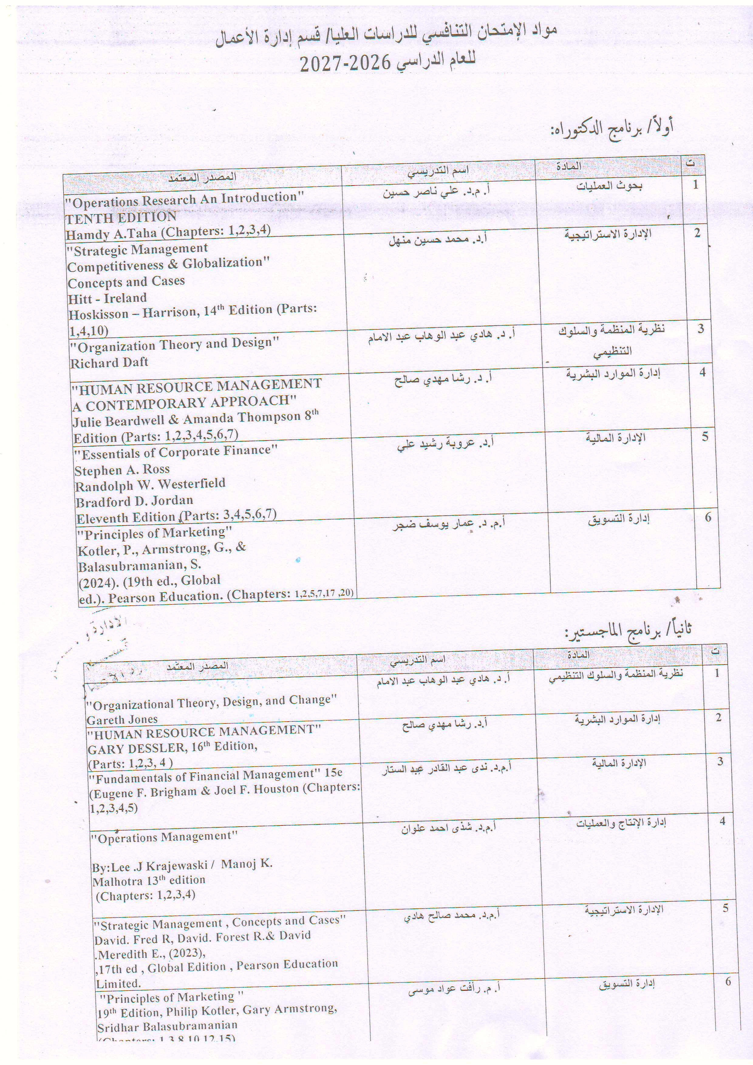 اعلان مواد الامتحان التنافسي للدراسات العليا في قسم ادارة الاعمال للعام الدراسي 2026_2027