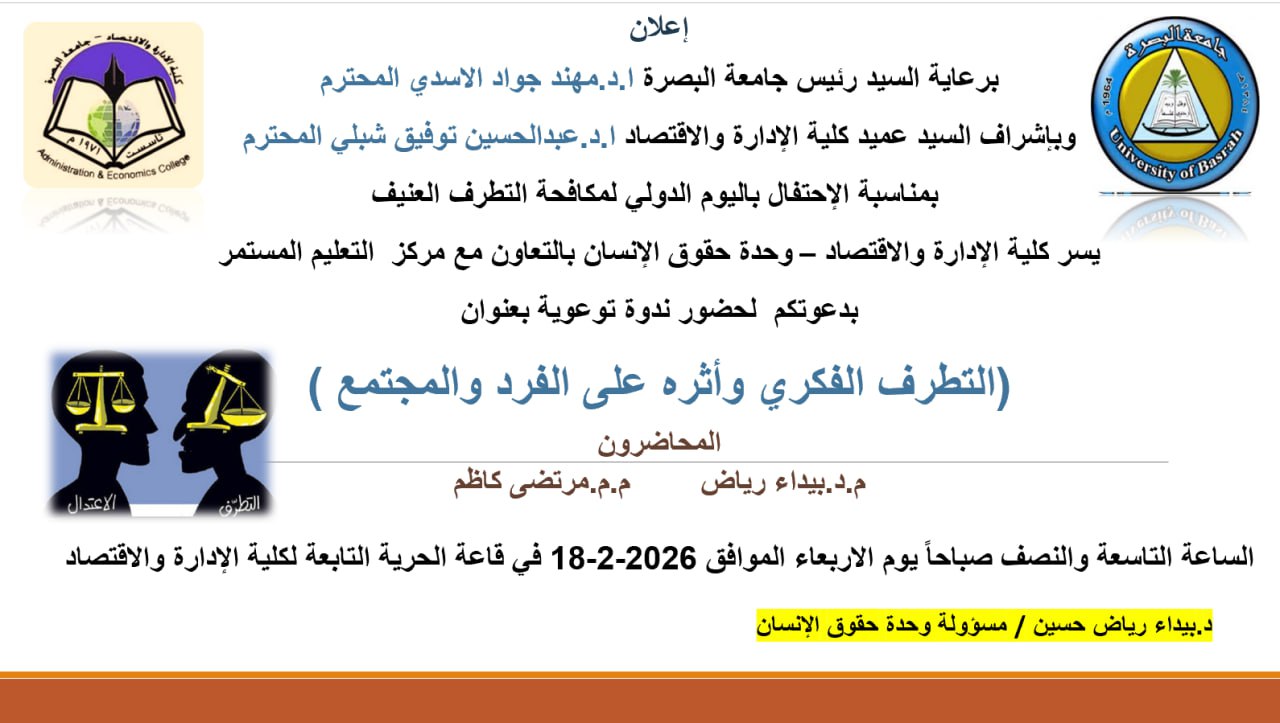 يسر كلية الإدارة والاقتصاد وحدة حقوق الانسان بالتعاون مع مركز التعليم المستمر بدعوتكم لحضور ندوة توعوية بعنوان